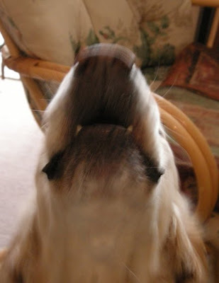 Well, if anyone of my dogs can do this it will be Scout. He's my talker. I've got him to verbalize before by facing him directly and talking to him about something he knows: Would you like a cookie?